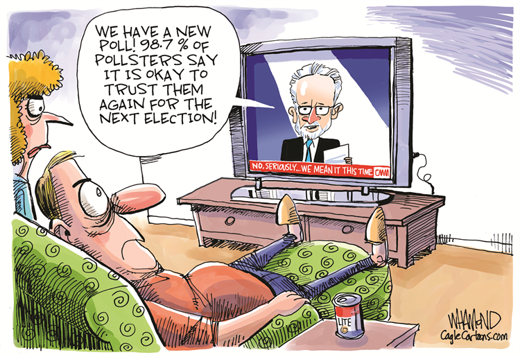 The irony is, despite their total whiff, pollsters will still make big bucks for what really amounts to an attempt at legal jury tampering. The supposition by political organizations that buy polls is if voters see their candidate as a winner in the pre-election polls, they’ll be likely to support him or her with real votes. Turns out voters may enjoy reading news stories about the latest polls but when they cast their ballots they think for themselves.